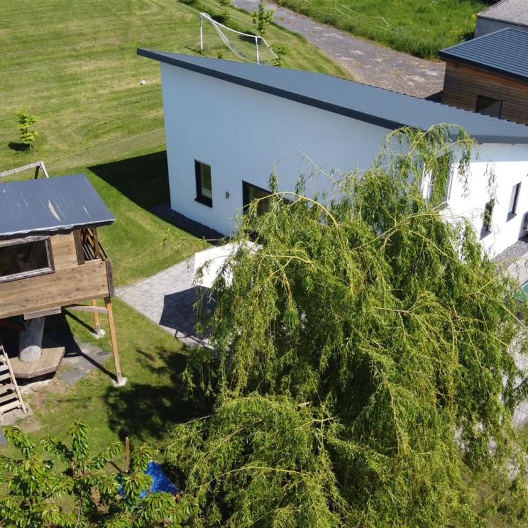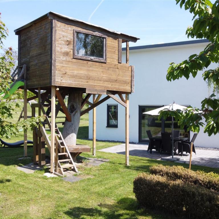 Spielegerüst, Spielwiese und Trampolin sowie das Baumhaus zur gemeinsamen Nutzung